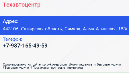 Техавтоцентр по адресу 443106, Самарская область, Самара, Алма-Атинская, 183г в дальнейшем Организация, размещена в следующих категориях: