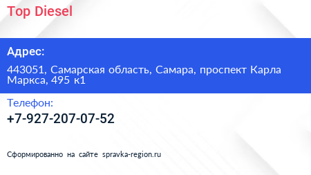 Top Diesel по адресу 443051, Самарская область, Самара, проспект Карла Маркса, 495 к1 в дальнейшем Организация, размещена в следующих категориях: