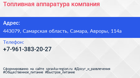 Топливная аппаратура, компания по адресу 443079, Самарская область, Самара, Авроры, 114а в дальнейшем Организация, размещена в следующих категориях: