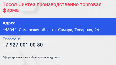 Тосол-Синтез, производственно-торговая фирма по адресу 443044, Самарская область, Самара, Товарная, 26 в дальнейшем Организация, размещена в следующих категориях: