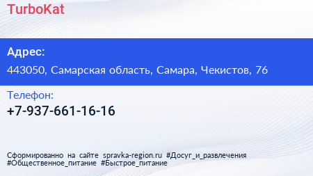 TurboKat по адресу 443050, Самарская область, Самара, Чекистов, 76 в дальнейшем Организация, размещена в следующих категориях: