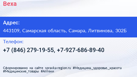 Веха по адресу 443109, Самарская область, Самара, Литвинова, 302Б в дальнейшем Организация, размещена в следующих категориях:
