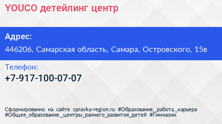 YOUCO, детейлинг-центр по адресу 446206, Самарская область, Самара, Островского, 15в в дальнейшем Организация, размещена в следующих категориях: