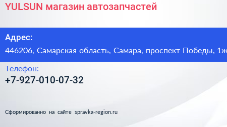 YULSUN, магазин автозапчастей по адресу 446206, Самарская область, Самара, проспект Победы, 1ж в дальнейшем Организация, размещена в следующих категориях: