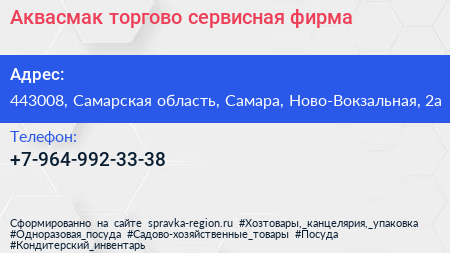 Аквасмак, торгово-сервисная фирма по адресу 443008, Самарская область, Самара, Ново-Вокзальная, 2а в дальнейшем Организация, размещена в следующих категориях: