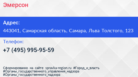 Эмерсон по адресу 443041, Самарская область, Самара, Льва Толстого, 123 в дальнейшем Организация, размещена в следующих категориях: