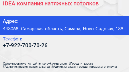 IDEA, компания натяжных потолков по адресу 443068, Самарская область, Самара, Ново-Садовая, 139 в дальнейшем Организация, размещена в следующих категориях: