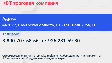 КВТ, торговая компания по адресу 443099, Самарская область, Самара, Водников, 60 в дальнейшем Организация, размещена в следующих категориях: