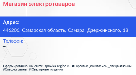 Магазин электротоваров по адресу 446206, Самарская область, Самара, Дзержинского, 18 в дальнейшем Организация, размещена в следующих категориях: