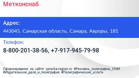 Метконснаб по адресу 443045, Самарская область, Самара, Авроры, 181 в дальнейшем Организация, размещена в следующих категориях: