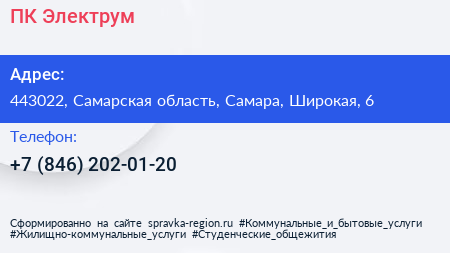 ПК Электрум по адресу 443022, Самарская область, Самара, Широкая, 6 в дальнейшем Организация, размещена в следующих категориях: