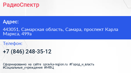 РадиоСпектр по адресу 443051, Самарская область, Самара, проспект Карла Маркса, 499а в дальнейшем Организация, размещена в следующих категориях: