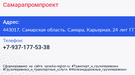 Самарапромпроект по адресу 443017, Самарская область, Самара, Карьерная, 24 лит ГГ1 в дальнейшем Организация, размещена в следующих категориях: