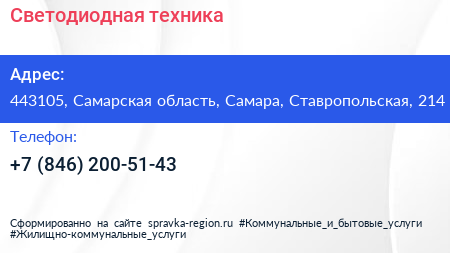 Светодиодная техника по адресу 443105, Самарская область, Самара, Ставропольская, 214 в дальнейшем Организация, размещена в следующих категориях: