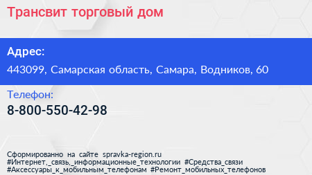 Трансвит, торговый дом по адресу 443099, Самарская область, Самара, Водников, 60 в дальнейшем Организация, размещена в следующих категориях: