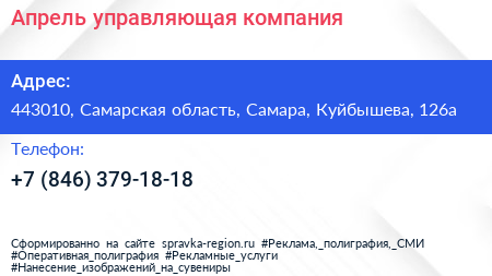 Апрель, управляющая компания по адресу 443010, Самарская область, Самара, Куйбышева, 126а в дальнейшем Организация, размещена в следующих категориях: