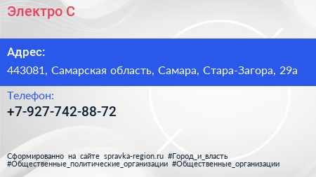 Электро-C по адресу 443081, Самарская область, Самара, Стара-Загора, 29а в дальнейшем Организация, размещена в следующих категориях: