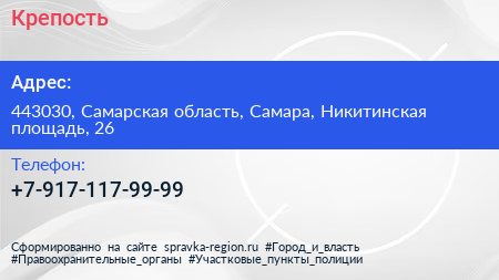 Крепость по адресу 443030, Самарская область, Самара, Никитинская площадь, 26 в дальнейшем Организация, размещена в следующих категориях: