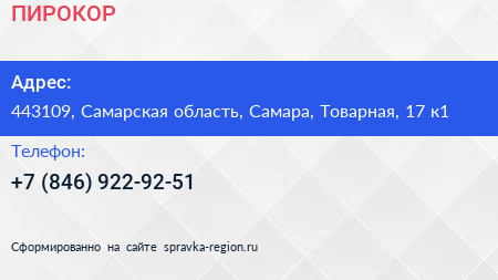 ПИРОКОР по адресу 443109, Самарская область, Самара, Товарная, 17 к1 в дальнейшем Организация, размещена в следующих категориях: