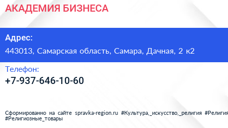 АКАДЕМИЯ БИЗНЕСА по адресу 443013, Самарская область, Самара, Дачная, 2 к2 в дальнейшем Организация, размещена в следующих категориях: