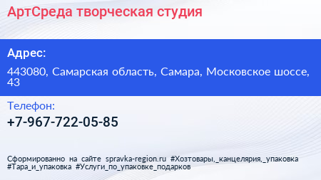 АртСреда, творческая студия по адресу 443080, Самарская область, Самара, Московское шоссе, 43 в дальнейшем Организация, размещена в следующих категориях: