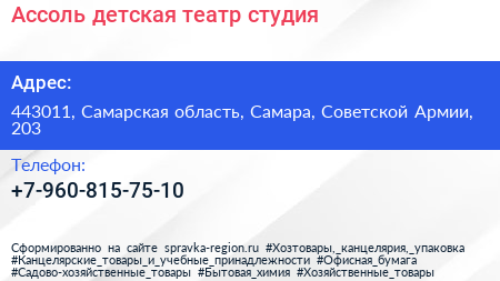 Ассоль, детская театр-студия по адресу 443011, Самарская область, Самара, Советской Армии, 203 в дальнейшем Организация, размещена в следующих категориях: