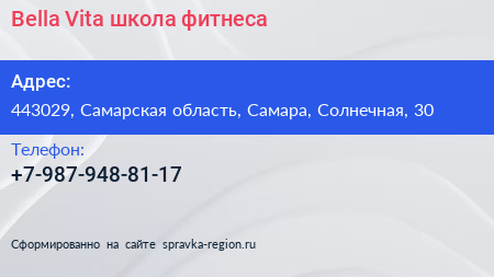 Bella Vita, школа фитнеса по адресу 443029, Самарская область, Самара, Солнечная, 30 в дальнейшем Организация, размещена в следующих категориях: