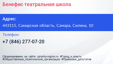 Бенефис, театральная школа по адресу 443115, Самарская область, Самара, Силина, 10 в дальнейшем Организация, размещена в следующих категориях: