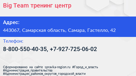 Big Team, тренинг-центр по адресу 443067, Самарская область, Самара, Гастелло, 42 в дальнейшем Организация, размещена в следующих категориях: