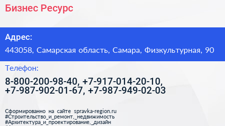 Бизнес Ресурс по адресу 443058, Самарская область, Самара, Физкультурная, 90 в дальнейшем Организация, размещена в следующих категориях: