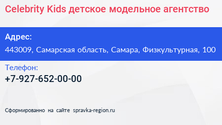 Celebrity Kids, детское модельное агентство по адресу 443009, Самарская область, Самара, Физкультурная, 100 в дальнейшем Организация, размещена в следующих категориях: