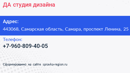 ДА, студия дизайна по адресу 443068, Самарская область, Самара, проспект Ленина, 25 в дальнейшем Организация, размещена в следующих категориях: