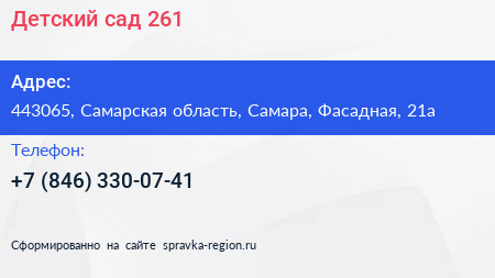 Детский сад №261 по адресу 443065, Самарская область, Самара, Фасадная, 21а в дальнейшем Организация, размещена в следующих категориях: