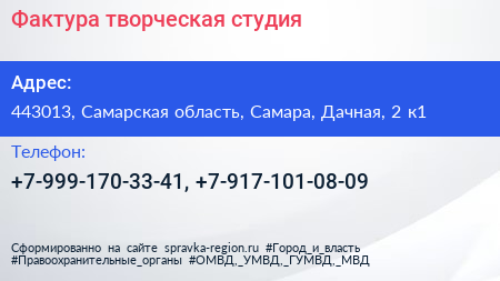 Фактура, творческая студия по адресу 443013, Самарская область, Самара, Дачная, 2 к1 в дальнейшем Организация, размещена в следующих категориях: