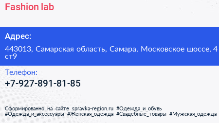 Fashion lab по адресу 443013, Самарская область, Самара, Московское шоссе, 4 ст9 в дальнейшем Организация, размещена в следующих категориях: