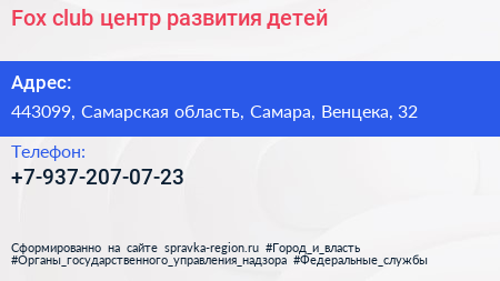 Fox club, центр развития детей по адресу 443099, Самарская область, Самара, Венцека, 32 в дальнейшем Организация, размещена в следующих категориях: