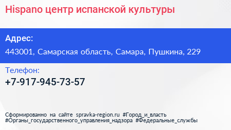 Hispano, центр испанской культуры по адресу 443001, Самарская область, Самара, Пушкина, 229 в дальнейшем Организация, размещена в следующих категориях:
