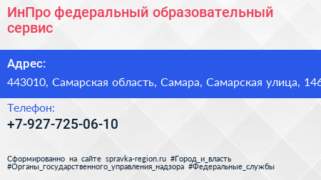 ИнПро, федеральный образовательный сервис по адресу 443010, Самарская область, Самара, Самарская улица, 146 в дальнейшем Организация, размещена в следующих категориях: