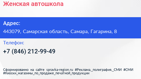 Женская автошкола по адресу 443079, Самарская область, Самара, Гагарина, 8 в дальнейшем Организация, размещена в следующих категориях: