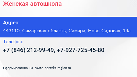 Женская автошкола по адресу 443110, Самарская область, Самара, Ново-Садовая, 14а в дальнейшем Организация, размещена в следующих категориях: