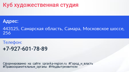 Куб, художественная студия по адресу 443125, Самарская область, Самара, Московское шоссе, 256 в дальнейшем Организация, размещена в следующих категориях: