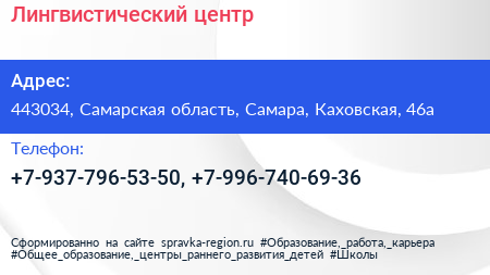 Лингвистический центр по адресу 443034, Самарская область, Самара, Каховская, 46а в дальнейшем Организация, размещена в следующих категориях: