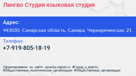 Лингво Студия, языковая студия по адресу 443030, Самарская область, Самара, Чернореченская, 21 в дальнейшем Организация, размещена в следующих категориях: