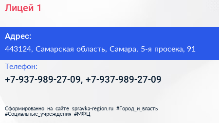 Лицей №1 по адресу 443124, Самарская область, Самара, 5-я просека, 91 в дальнейшем Организация, размещена в следующих категориях: