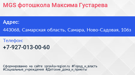 MGS, фотошкола Максима Густарева по адресу 443068, Самарская область, Самара, Ново-Садовая, 106з в дальнейшем Организация, размещена в следующих категориях: