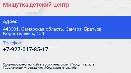 Мишутка, детский центр по адресу 443001, Самарская область, Самара, Братьев Коростелёвых, 154 в дальнейшем Организация, размещена в следующих категориях: