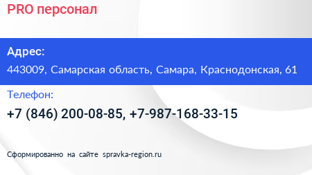 PRO персонал по адресу 443009, Самарская область, Самара, Краснодонская, 61 в дальнейшем Организация, размещена в следующих категориях: