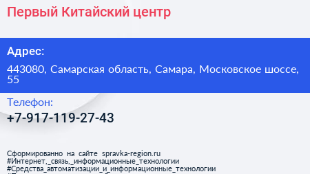Первый Китайский центр по адресу 443080, Самарская область, Самара, Московское шоссе, 55 в дальнейшем Организация, размещена в следующих категориях: