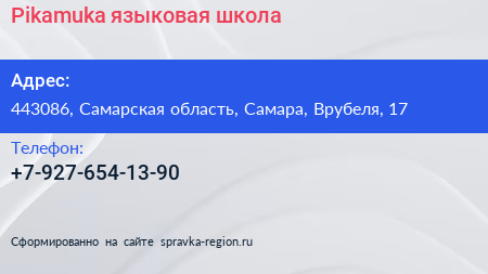 Pikamuka, языковая школа по адресу 443086, Самарская область, Самара, Врубеля, 17 в дальнейшем Организация, размещена в следующих категориях: