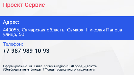Проект-Сервис по адресу 443056, Самарская область, Самара, Николая Панова улица, 50 в дальнейшем Организация, размещена в следующих категориях:
